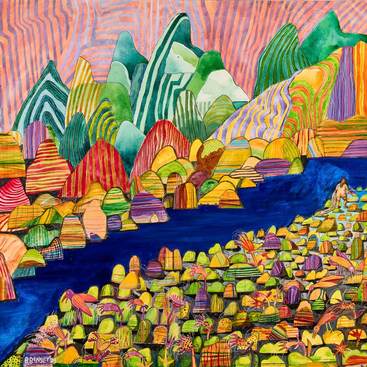 Is that a Tiger Iris or a Buttercup upstream? Bill Bensley , 2023 Acrylic 120 × 120 cm , 47.2 × 47.2 inch Sold!