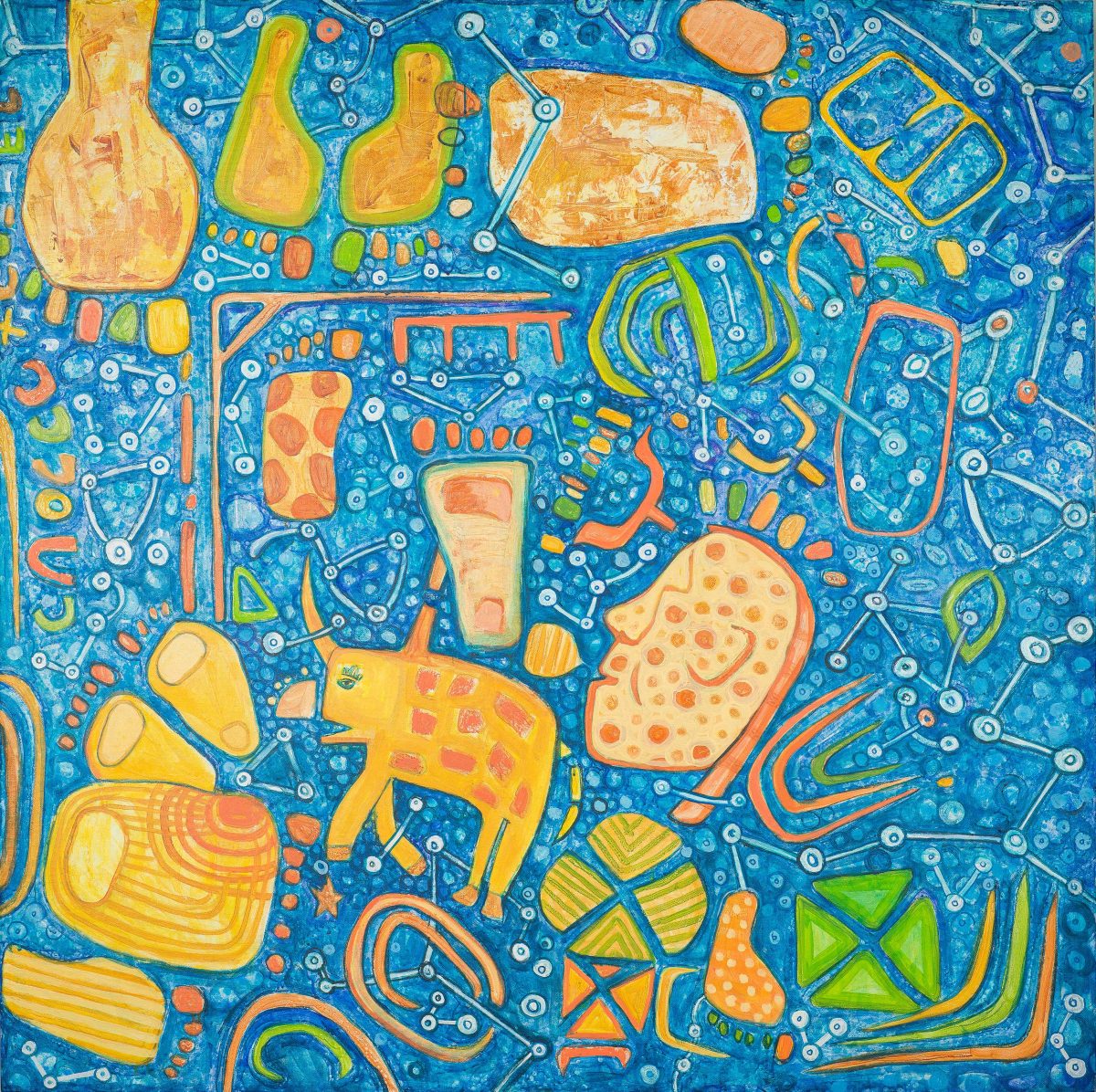 In land or south from Karma Bay about one kilometer, we stopped at a flat stone plateau called Eriosh that looked as though it had once been a river bed and a village at the same time. There was absolutely nobody there. No signs or fences. Nothing there besides these 1,500 year old mysterious symbols, most buried under a thin layer of silt. The stone floor was worn smooth and was full of primitive markings and holes where wooden columns for homes may have been erected. I drew everything I saw in the 1000 square meters that I inspected and amalgamated all of the visible markings on to this one drawing, in a much denser fashion than what was visible in the field.