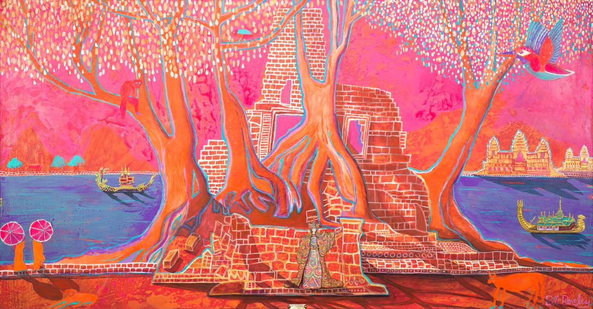 The ancient Khmer temples and palaces at Angkor Wat have long since beenembraced and sometimes strangled in a fierce embrace by the roots of thebanyan trees. Two monks, shielding themselves from the midday sun,pass by, dwarfed by the majestic scene, as Royal barges sail paston the giant moat