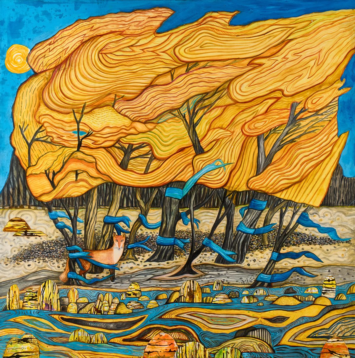 Why does the fox look as if he was turned to stone? Bill Bensley , 2023 Acrylic on canvas 120 × 120 cm , 47.2 × 47.2 inch Sold!